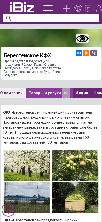 | Название / Заголовок | Берестейское КФХ - Производство плодоовощной продукции. Яблоки. Груши. Огурцы. Помидоры. Перец. Пекинская капуста. Белокочанная капуста. Арбузы. Сливы. Голубика.. 224024, Брест, , Шоссейная, 2 |