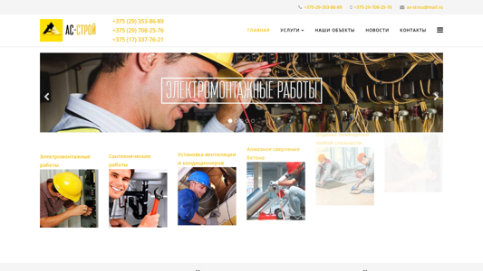 | AI-анализ | The portal As-stroy: sanitary and electrical installation works in Minsk. Offering installation services for heating systems, drainage systems, water supply systems, exterior engineering networks, heating points and boilers, technical equipment, commissioning works, electrical wiring, lighting systems, electrical panel equipment, exterior electrical installation works, grounding and lightning protection, outdoor lighting. Keywords: sanitary, electrical installation, works, Minsk, under contract. Top words: works 21, systems 10, installation 9, montage 9, sanitary 8, electrical installation 8, as-stroy 7, 375 6, heating 6, replacement 6, services 5, ventilation 5, conditioning 4, almaznoe 4, drilling 4, compression 4, news 4, equipment 4, maintenance 4, main |