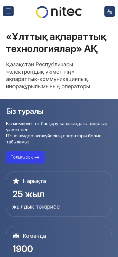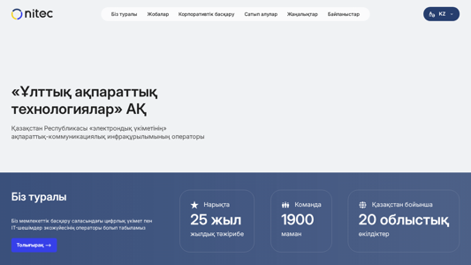 | AI-анализ | This website, titled "АҚ «Ұлттық ақпараттық технологиялар» (Nitec.kz), is a corporate platform focusing on IT and communication infrastructure services as operators in the electronic government sector in Kazakhstan. With over 25 years of experience, the company has a team of 1900 employees spread across various locations in Kazakhstan. The team is committed to innovation, collaboration, efficiency, and a customer-focused development approach. Services offered include IT infrastructure, DevOps and AI community, corporate services, and various support functions such as HR, compliance, and audit. The website also features a news section and a careers page. The most frequently used words on the website are 'country', 'technology', 'electronically', 'men', 'locally', 'you', 'republic', 'job', 'platform', 'services', |