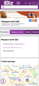 | AI-анализ | The website is for Modernstroy ODO, a company based in Vitsebsk, Belarus, producing and supplying doorphone equipment on the SKUD market. The homepage includes information on the company's address (Sovietskaya 13, Vitsebsk 210026), contact telephone number (+375 29 591 39 xx), and a map for directions. The site offers various categories such as 'Companies', 'Safety and Security', 'News', 'Announcements', 'Purchases', 'Vacancies', 'Videos', 'Reviews', and 'Contacts'. The company provides products and services related to safety and security, and is listed in the 'Safety and Security in Vitsebsk' category. The website is operated by AIBIZ MEDIA LLC. |