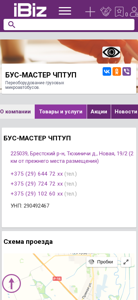 | AI-анализ | The portal Busmaster.ibiz.by is a business website that offers services for the transformation of cargo microbuses. It provides a scheme for reaching the company, contact phone numbers, and an address in Belarus, specifically in the Brest region, on Tuyhinchy Street in the New settlement, number 19/2, which is 2 km away from its previous location. The website includes sections for company information, products and services, news, announcements, vacancies, videos, and testimonials. The company's phone numbers are +375 (29) 644 72 xx, +375 (29) 724 72 xx, and +375 (29) 102 60 xx. The business hours are Monday through Friday from 9:00 to 18:00 |