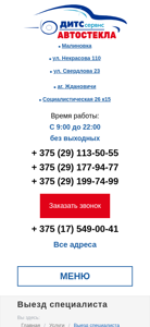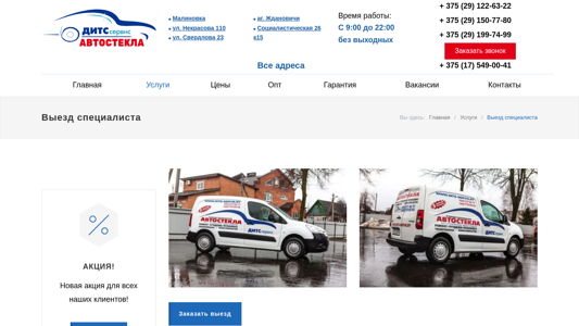 | AI-анализ | The web project "DITS service" offers a specialist to come to your home or garage in Minsk for the replacement and repair of your car's windshield. DITS service has been a professional team in the auto glass market since 1998. Contact numbers are provided. Addresses include Malinovka, ul. Nekrasova 110, ul. Sverdлова 23, ag. Zhdanovichi, and soc. Socialistischeskaya 26 k15. The service operates from 9:00 to 22:00 without weekends. Contact numbers are (29) 122-63-22, (29) 150-77-80, (29) 199-74-99, and (17) 54 |