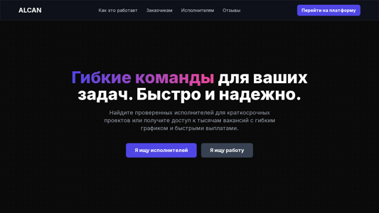 | SEO-описание | ALCAN — это платформа для быстрого поиска проверенных исполнителей на краткосрочные проекты. Автоматизация контрактов, быстрые выплаты и гибкие условия для заказчиков и исполнителей. |