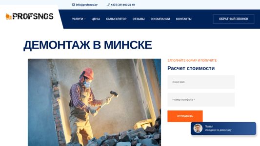 | AI-анализ | --- The website ProfSnos.by offers demolition and dismantling services in Minsk and the Minsk region. The company provides full and partial demolition of various complexities, as well as debris removal and waste disposal. They work with both physical and legal entities. The website includes information on various demolition services such as dismantling walls, ceilings, foundations, chimneys, floors, balconies, and various types of finishes including plaster and tiles. Additionally, the company offers house demolition, removal of insulation, and disposal of household structures. After a fire or repair, the company offers cleanup services and waste removal. Prices and a calculator are also provided on the website. The company has received positive reviews and contact information is available for inquiries in Minsk. The website also includes information on the types, purposes, and specifics of demolition work |