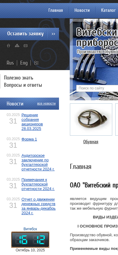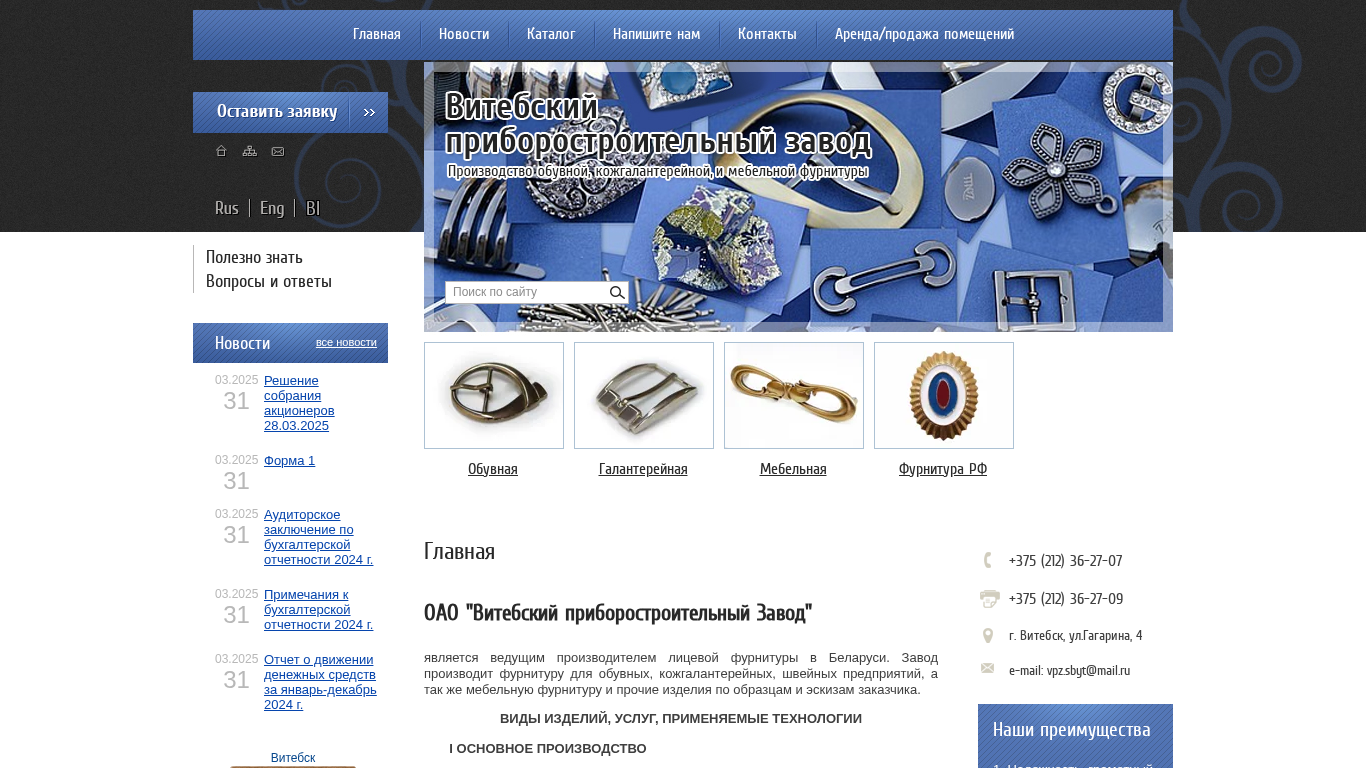 | AI-анализ | --- This online resource belongs to OAO VPZ, the leading manufacturer of decorative fittings in Belarus. The factory produces fittings for footwear, leather goods, textile, and furniture industries, as well as other items based on client specifications. Products and Services: The company specializes in the production of decorative fittings for the footwear, leather goods, textile, and furniture industries. They offer various coatings including galvanic: tinning, nickel plating, brass plating, and zinc plating. Vacuum coatings: nitride titanium and carbide titanium. Technologies used: pressure casting of alloy ZAM; cold stamping of brass and steel items; cyanide tinning and tinning; acid and alkaline tinning; bright and matte nickel plating; tinning; and |
