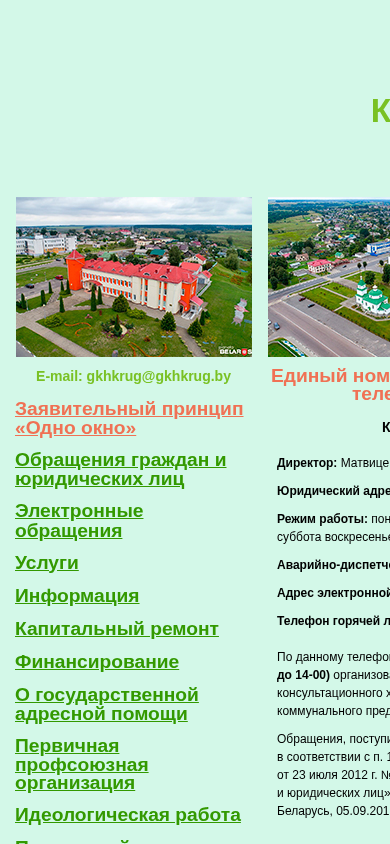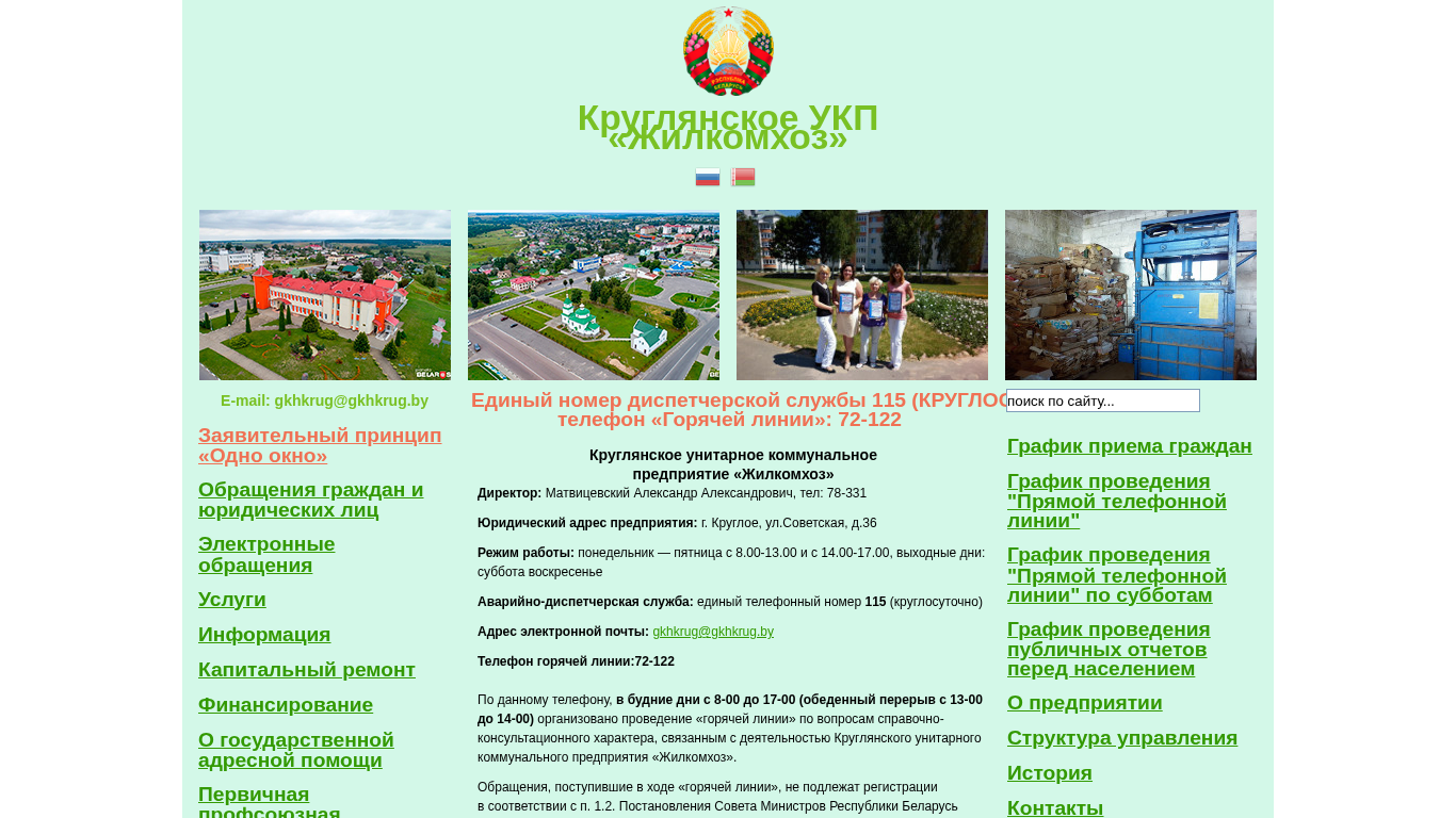 | AI-анализ | The website belongs to the Kruglyanokoe Unitary Communal Enterprise 'Жилкомхоз' (Housing and Communal Enterprise) based in Krugloe, Belarus. The homepage includes a JavaScript ImageSlideShow, which requires the user to enable JavaScript to view the content. The website also contains contact information, including an email address (gkhkrug@gkhkrug.by) protected by Javascript and a hotline number (72-122). The company's office hours are Monday to Friday from 8:00-13:00 and 14:00-17:00, with weekends being the exceptions. The website provides a single phone number (115) for emergency services and a 'hotline' for inquiries related to the company's operations, which is operational from Monday to Friday, |