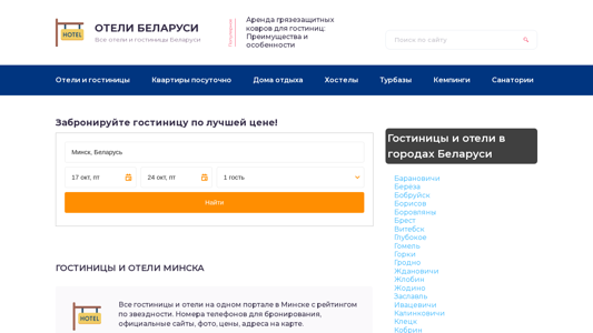 | SEO-описание | Все гостиницы и отели Минска и Беларуси. Забронировать номер в гостиницах и отелях Минска на сутки всего от 29 рублей. Номера телефонов, адреса, цены, отзывы, официальные сайты. |