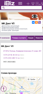 | AI-анализ | The web project MK Dent CHP offers dental diagnoses, consultations, preventive examinations, professional dental hygiene, tooth treatment, and orthopedics. The company is located in Polotsk, Belarus, at the address Коммунистическая, 27, комн. 201. Contact numbers for the clinic are +375 (214) 42 64 xx and +375 (33) 648 13 xx. The business registration number is 390510405. Regular operating hours are Monday through Friday, 9:00 AM to 6:00 PM, with no lunch break. The company is listed under the category 'Dentistry' in the Yandex business catalog. |