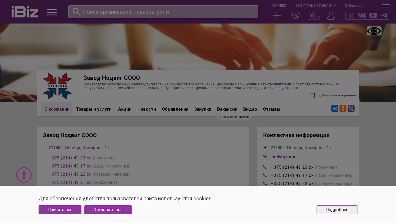 | Название / Заголовок | Завод Нодвиг СООО - Производство асинхронных электродвигателей 71 и 80 высоты оси вращения. Трехфазные асинхронные электродвигатели. Электродвигатели серии АДР (регулируемые) и серии АДИ (исполнительные). Однофазные асинхронные электродвигатели. Электродвигатели специального. 211400, Полоцк, , Комарова, 17 |