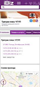 | AI-анализ | This online resource is a business website for Тригран плюс ЧТУП, a company located in Полоцк, Belarus, specifically at Октябрьская street number 54-403. The company offers services related to the sale of cartridges and the repair of office technology. The website provides contact information, including three phone numbers for different telecommunications providers, and a map for easy access. The business hours are from 9:00 AM to 6:00 PM, Monday through Friday, with Saturday and Sunday being days off. The website also includes a company profile, information on their products and services, and various contact options for customers. Keywords associated with the website include 'услуги' (services), 'без' (without), 'оргтехника' (office technology), and '211400' ( |