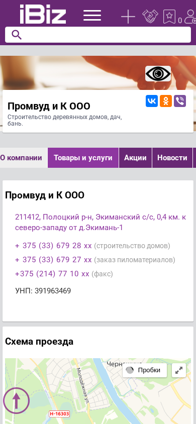| AI-анализ | --- This online resource is dedicated to Promwood and K OOO, a Belarusian company specializing in the construction of wooden houses, cottages, and saunas. The website provides a map scheme and contact information, including phone numbers for building homes and ordering pine materials. The company's Unified State Register number is 391963469. The website offers sections for company information, products and services, news, job vacancies, and customer reviews on social media platforms such as VKontakte and Odnoklassniki. The contact hours are Monday to Friday from 9:00 to 18:00 without lunch breaks. The company is located in the village of Ekiman-1, Posolskoy district, Minsk region, 0.4 km to the northwest. The phone numbers for building houses and ordering pine materials are +3 |