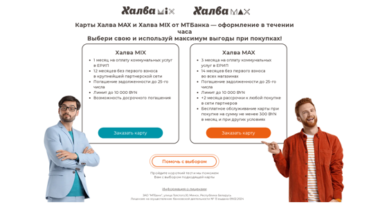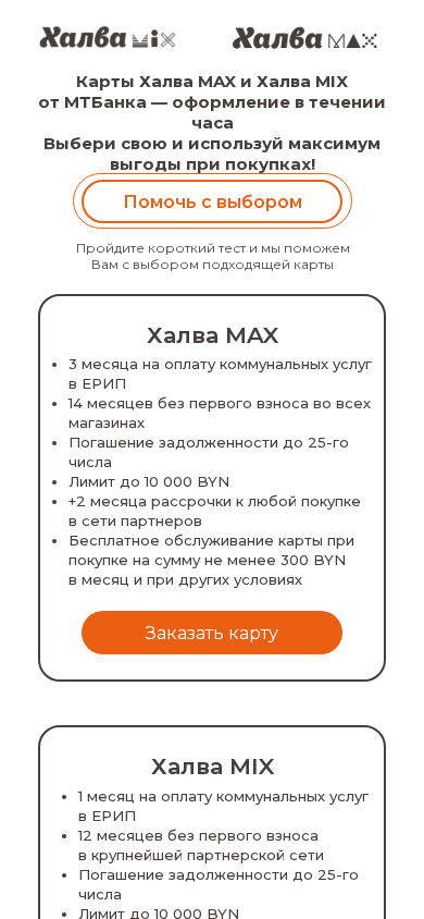 | SEO-описание | Карты Халва MAX и MIX от МТБанка лимитом до 10 000 рублей. Пользуйся больше года без первого взноса во всех магазинах. Оплачивай коммунальные услуги в ЕРИП. Досрочное погашение с карты Visa и MasterCard любого банка без комиссии. Для оформления понадобится паспорт. Даем 25000 BYN на все покупки. |