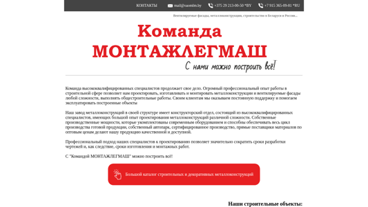 | AI-анализ | The website is for the Belarusian company МОНТАЖЛЕГМаш, specializing in ventilated facades, metal constructions, and construction in Belarus and Russia. The team of highly qualified specialists continues their work, offering clients constant support and helping them maintain the built structures. The company's metal construction factory includes a design department staffed with experienced professionals capable of designing complex metal structures. The factory's own production capabilities, equipped with modern machinery and able to produce the entire product cycle, a large vehicle fleet, certified production, and direct material suppliers ensure high-quality and affordable products. The professional approach of the specialists allows for significant reductions in drawing development times and, consequently, in production and installation schedules. With МОНТАЖЛЕГМаш, you can build anything. The company's catalog includes a wide range of building and decorative metal structures |