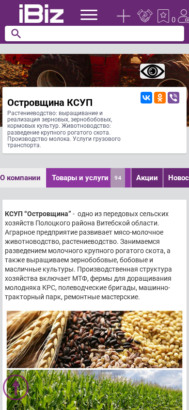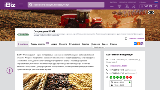 | AI-анализ | This website is a farming cooperative named Ostrovщина KСУП, located at 211438, , Ostrovschina d., Solnechna, 1. The business specializes in both crop and livestock farming, with a focus on raising dairy cattle, growing zernovyh (grains), zernobobovyh (legumes), and other crops for livestock feed, as well as providing transportation services. The title and description of the website mention various agricultural activities, including farming, livestock breeding, milk production, and transportation services. The keywords support this, with a strong emphasis on farming-related terms like 'rakitovye kultury' (legumes), 'kormovye kultury' (crop feed), 'zelenogorodskoe khoziaistvo' (ag |