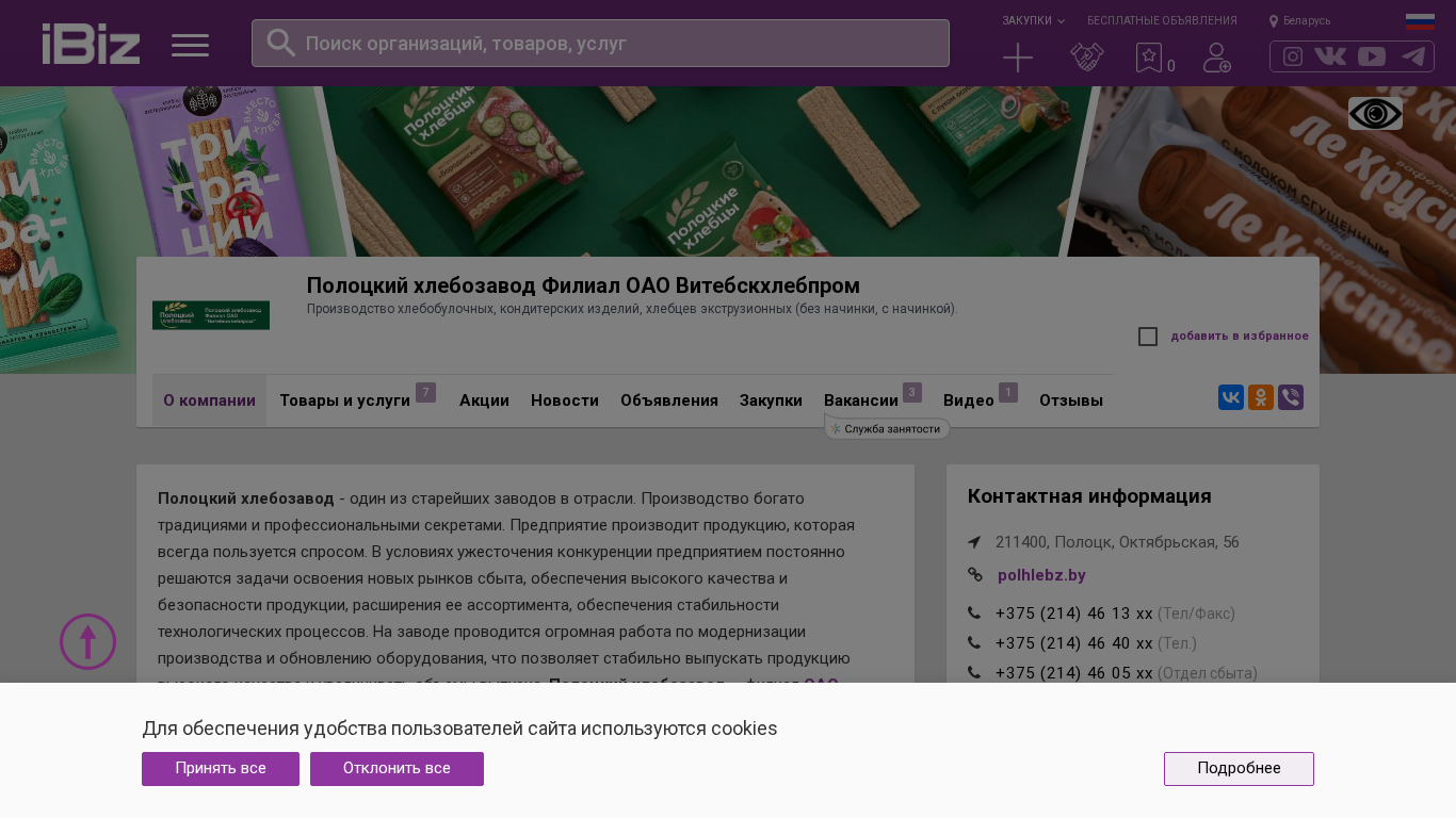 | AI-анализ | This online resource is a website for the Pozhalskiy Bread Factory Filial of OAO Vitsebskhlebprom, located in Polotsk, Belarus at the address October Street 56. The website provides information about the production of bread, bakery products, extruded breadsticks, and confectionery items. The site includes a map for directions, contact telephone numbers, and the company address. The website features sections for company information, products and services, news, job openings, videos, and customer reviews on social media platforms VKontakte, Odnoklassniki, and Viber. The Pozhalskiy Bread Factory is a long-standing enterprise with a rich history and professional expertise. The company consistently meets market demand with its high-quality and safe products. Despite increasing competition, the factory continuously addresses challenges such as expanding sales markets, ensuring product |