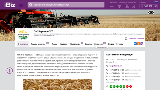 | AI-анализ | The web project "P-S Karpeki SUP" is a mixed agricultural business with a well-developed livestock and crop farming division. They grow cereals and legume crops, sell chickpeas and rapeseed. The business also produces milk and meat. Located in Belarus, at Karpeki Ag, Rechna Street, number 2. The company offers various agricultural products and services, including livestock, zernovaia kultura (cereals), maslianaia kultura (oilseeds), zernobobovaia kultura (legumes), and milk. The agricultural holding is home to a herd of 1,440 heads of large cattle, with 460 of these being milking cows. The farm uses modern technologies such as electronic field maps, GPS navigation, and other supporting tools. P-S Kar |