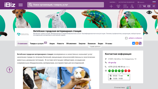 | AI-анализ | This online resource is dedicated to Vitsebsk City Veterinary Station (Vitsebsk Gorvetstanstia), offering a range of veterinary and specialized services with qualified consultation. The station provides treatment, prevention, vaccination, laboratory investigations, and veterinary-sanitary supervision. The address and contact numbers of the company are also provided. |