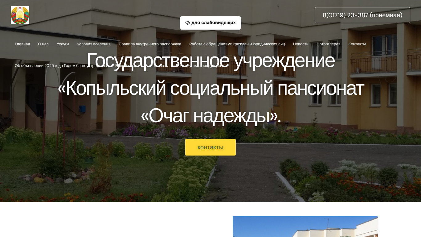 | SEO-лексика | граждан 01719 социального беларусь копыльский приемная 2025 проведение без далее день тел государственное учреждение 23-387 новости контакты социальный пансионат пансионата |