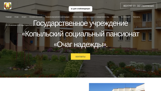 | AI-анализ | The web project "Kopyl Social Pensionate 'Ochag Nadiezhy'" is a state-owned institution providing care for the elderly and disabled. The website includes information on the organization's services, conditions of living, rules, and procedures for dealing with inquiries from citizens and legal entities. The main objectives of the social pensionate are to assist citizens in adapting to their new environment, provide social services as mandated by the government, offer additional social services as determined by the institution, help residents with technical assistance for social rehabilitation, and provide medical care and sanitary-epidemiological measures in accordance with the law. The website also offers information on cultural activities, rehabilitation programs, and staff training. The contact information for the pensionate, including a phone number and address, is provided. |