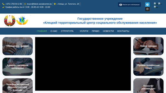 | AI-анализ | The website is a government social service center for the elderly, disabled, large families, families with disabled children, and orphans in Kletsk, Belarus. The center's specialists stand guard for the interests of these vulnerable population groups, conduct social assessments and provide services such as housing safety, humanitarian aid, rehabilitation, child care, psychological and legal consultation, social initiatives, programs and projects. The website contains information on their services, administrative procedures, and news. The contact information includes a phone number and telegram and Instagram handles. The center operates Monday to Friday from 8:00 to 19:00 and Saturday from 9:00 to 13:00. It also offers emergency psychological help and a hotline for reporting cases of domestic violence. The website includes sections on assistance for pensioners, accessible environment, active aging, humanitarian cooperation, and prevention of domestic violence. |