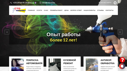 | AI-анализ | The portal is a vehicle repair and painting service, named STO Kolorvit, located in Vitsebsk, Belarus. They provide services such as body repair, painting of cars and wheels, repair of bumpers, execution of welding jobs, and anti-corrosion treatment. The company also offers a local repair and repair of cars under insurance after accidents. Additional services include the repair of mufflers, the replacement of fenders, and the removal and replacement of catalytic converters. They have been in operation for over 12 years and offer a guarantee and high-quality work. The website contains information on their services, examples of their work, pricing, FAQs, client testimonials, and contact information. |