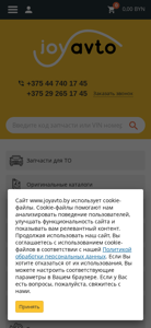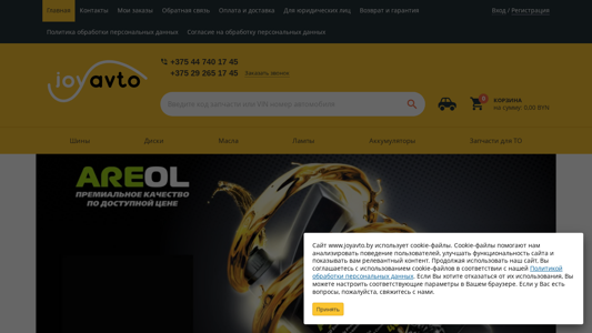 | AI-анализ | This online resource is the website of an internet shop selling auto parts in Vitebsk, Belarus. The title of the website is "Joyavto.by - Интернет-магазин автозапчастей в Витебскe". The site uses cookie-files to analyze user behavior and improve site functionality. The main product categories are: shoes, oils, lamps, and accumulators. Other categories include parts for technical operation, original catalogs, accessories, and various tools. The site offers a garage feature and has sections for contacts, orders, returns, and policies. The top keywords are: "масла" (oils), "персональных" (personal), "данных" (data), "жидкости" (liquids), "шин" (tires), "шины" (wheels), "лампы" ( |