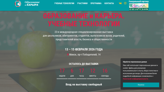 | AI-анализ | The portal Education and Career is a specialized exhibition in Minsk for schoolchildren, students, graduates, parents, government representatives, businesses, and the public. The event, organized by the Ministry of Education of the Republic of Belarus, is the largest exhibition of educational institutions, educational technologies, and jobs in Belarus. Every year, over 18,000 visitors attend the exhibition over three days. Participants include universities, colleges, lyceums, institutes of postgraduate education, educational centers, schools of foreign language studies, employers, and manufacturers and suppliers in the industry. The exhibition provides an opportunity to choose a university and profession, start earning independently, and assess a career in IT. The event takes place on February 13-15, 2026, from 10:00 to 18:00 on February 13 and 14, and from |