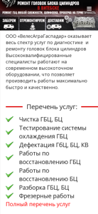 | AI-анализ | This online resource is the official website of OOO "VelesAgraGaspadar," a company based in Vitebsk, Belarus, which offers services related to the repair of head gaskets (ГБЦ) and blocks of cylinders. The homepage displays a menu with options for 'Main,' 'Prices/Services,' 'Contacts,' and a contact phone number and email address. The company specializes in providing high-quality repair services using skilled professionals and advanced equipment. The listed services include cleaning, testing, deficiency diagnosis, and restoration work for both head gaskets and cylinder blocks. The website also mentions benefits such as quick turnaround, qualified specialists, modern equipment, competitive pricing, cash and non-cash payment options, and pick-up and delivery services. The company's address is given as ul. Michurina, d. 5 in Vite |