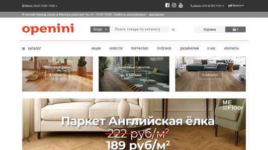 | AI-анализ | This website is for Openini, a flooring and door salon based in Minsk and Grodno, Belarus. The company offers various flooring options including parquet and parquet flooring, vinyl floors, laminate, and interconnected doors from top global brands. The website includes information about the stores' operating hours, phone numbers, and addresses in Minsk and Grodno. It also features an online shopping section with separate hours and contact information. The website is available in Russian rubles and Belarusian rubles. The main categories of products include parquet flooring, vinyl floors, laminate, carpets, sports floors, and related accessories such as adhesives, paints, and maintenance tools. There are sections for sales, promotions, and a catalog for each product category. The website also includes a FAQ section for customers, as well as information about |