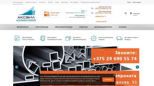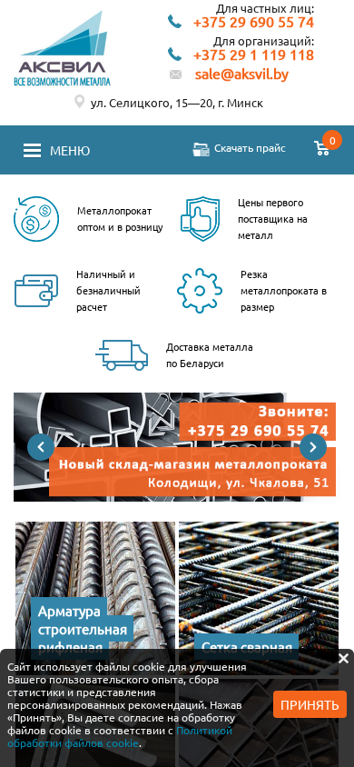 | SEO-описание | Металлобаза Аксвил - Оптовая, розничная продажа металлопроката в Минске, наличный и безналичный расчет. Резка металла в размер, погрузка. Низкие цены. Доставка по Беларуси |