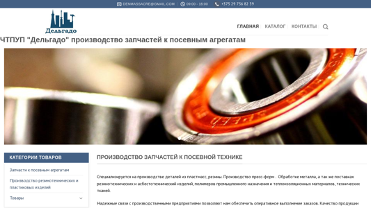 | AI-анализ | --- The web project "Дельгадо Запчасти к посевным агрегатам, сеялкам | Дельгадо" is a Belarusian e-commerce website specializing in the production and sale of parts for agricultural equipment and seeders. The website's main categories include parts for agricultural machinery, production of rubber and plastic products, asbestos-containing items, and various types of shafts, rings, and bearings. The homepage features a catalog of products, with subcategories such as "Podshipniki sharikovye radial'nye odnoraydnye s uplotneniiamy" (radial open bearings with bushings) and "Konel'niki dlya podshipnikov" (bearing mounts). The website also offers industrial textiles, rubber belts, hoses, |