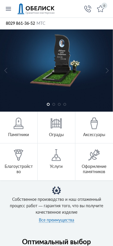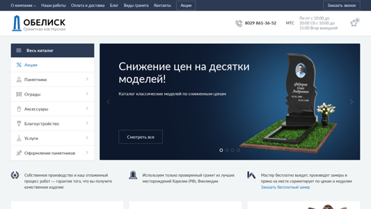 | AI-анализ | --- The website obelisk.by is an e-commerce platform specializing in the sale of memorials and related accessories. The website offers a wide variety of models, including single and double monuments, crosses, hearts, and more, made of granite and other materials. The company also provides services such as installation, restoration, and 3D modeling. The website includes sections for ogradas (enclosures), accessories like vases and lamps, and bлагоустройstvo (landscaping). Customers can contact the company by phone at 8029 861-36-52 or 861-36-52 using the MTs network, and the store is open for calls Monday through Saturday from 10:00 to 20:00 and on Sundays from 10:00 to 15:0 |