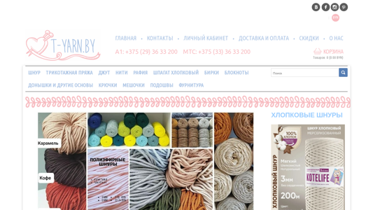 | SEO-описание | T-Yarn.by - вязание от слов к делу - здесь ВЫГОДНЫЕ цены ждут Вас каждый день, а не только на акциях ВСЕГДА в наличии трикотажная пряжа, полиэфирный, гамаковый и хлопковый шнур, рафия, джут, нити для вязания, пряжа для вязания одежды и аксессуаров БЫСТРО обрабатываем заказы, советуем и помогаем НЕТ минимального заказа |