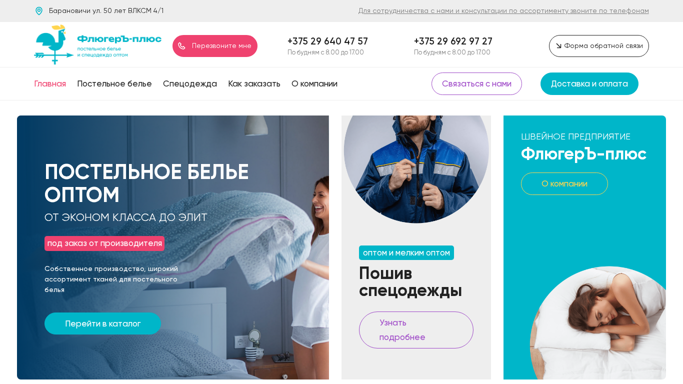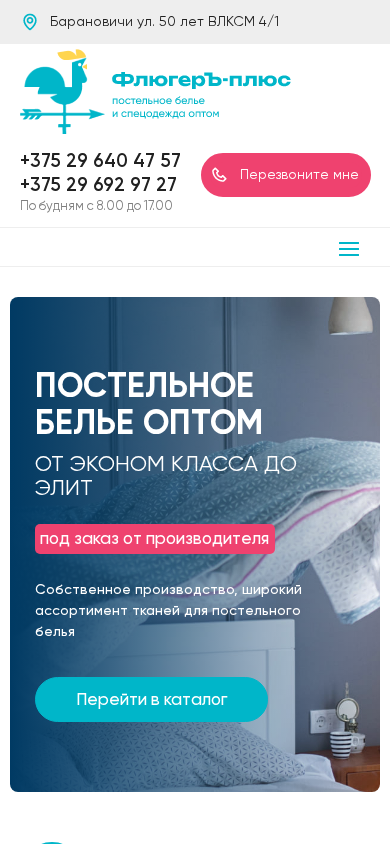 | AI-анализ | This online resource, titled "Постельное белье и спецодежда | ЧТПУП «ФлюгерЪ-плюс»," offers bed linen and workwear for sale from the manufacturer. The website provides both retail and bulk purchases of bed linen and workwear. The contact information includes phone numbers for Baranovich, Belarus: +375 29 640 47 57 and +375 29 692 97 27. The business hours for consultations and orders are from 8:00 to 17:00. The website includes sections for 'Contact Us,' 'Delivery and Payment,' and 'Company.' The company manufactures its own bed linen and workwear, featuring a wide range of fabric options for bed linen. Customers can browse a catalog |