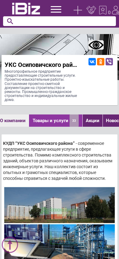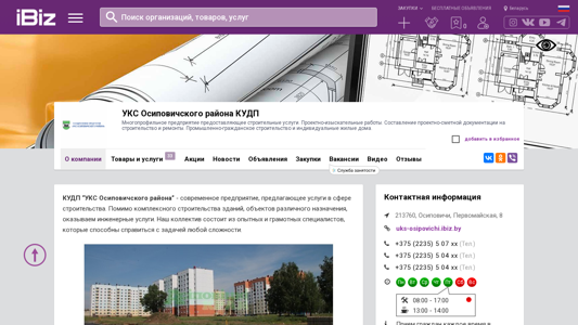 | Название / Заголовок | УКС Осиповичского района КУДП - Многопрофильное предприятие предоставляющее строительные услуги. Проектно-изыскательные работы. Составление проектно-сметной документации на строительство и ремонты. Промышленно-гражданское строительство и индивидуальные жилые дома.. 213760, Осиповичи, , Первомайская, 8 |