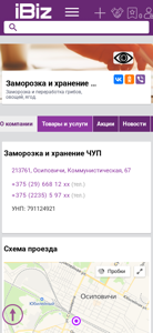 | AI-анализ | language: ru The web project "Freezing and Storage CHUP" is a Belarusian business based in Osipovichi, Kommunisticheskaya, 67. The company specializes in freezing and storage of mushrooms, vegetables, and berries. The website provides a contact list with two phone numbers: +375 (29) 668 12 xx and +375 (2235) 5 97 xx, and an address: 213761, Osiповичи, Коммунистическая, 67. The company's UNP number is 791124921. The website also includes a map and information about business hours, which are Monday to Friday from 9:00 to 18:00 without lunch. The company is listed |