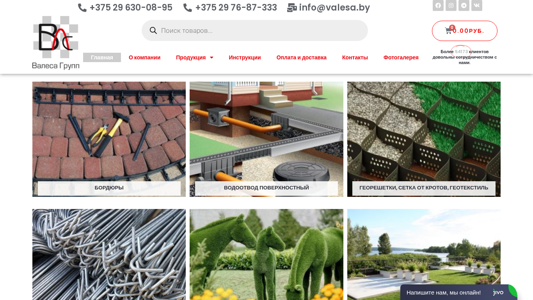 | AI-анализ | This website, Valesa.by, is an online store specializing in landscaping products. The title is "Главная" and the description mentions "Перейти к содержимому" and several contact details, but no actual description of the products or services is provided. The keywords include "товаров" (goods), "ландшафтный дизайн" (landscape design), "геотекстиль" (geotextile), "крепеж" (fasteners), "инструменты" (tools), "террасы" (terraces), "эксплуатируемые кровли" (ex exploitable roofs), and "водоотвод" (water drainage). The top_words indicate a focus on bordures, georeshnetki (geogrid), seetka |