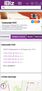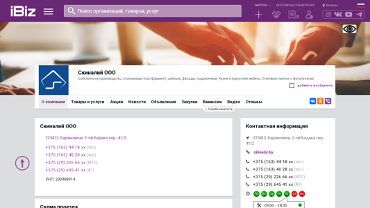 | AI-анализ | This website is for the Belarusian company Скиналий ООО, located in Baranovichy at 2-ой Бадака пер., 41/2. The company specializes in the production of countertops (postforming), skirting boards, facades, window sills, kitchens, and corpus furniture. They also offer photo-printed wall panels. The website provides contact information, including several phone numbers and a map scheme for reaching the company. The main products and services are mebel'nya furniture, komplektuyuji (completing components), mebel' korpusnaya (corpus furniture), and dsp stoletsnica (countertop production). |