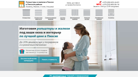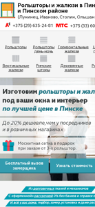 | AI-анализ | The portal jalusipinsk.by offers rollshutters and jalousie in Pinsk for purchase. Rollshutters and jalousie in Pinsk and the Pinsk region (Luniнеc, Ivanovo, Stolin, Olshany) include free measurement, delivery, and installation. Phone numbers for inquiries are provided from 9:00 to 22:00 daily. Rollshutters include day-and-night options, horizontal jalousie, plyssé curtains, vertical jalousie, Roman curtains, wooden jalousie, roll-ups, and custom-made rollshutters and jalousie for windows and interiors at the best price in Pinsk. Save up to 20% compared to intermediaries and retail stores. A mosquito net is included as a gift with orders of three |