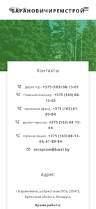 | AI-анализ | This website belongs to УКРСП «Барановичиремстрой» (BARANOVICHIREMSTROY), a construction company based in Baranovichy, Belarus. The address is given as ul.Brestskaya 297a, 225413, Brestskaya oblast, Belarus. The company can be reached by phone at +375 (163) 61-89-84. The title of the website is "УКРСП «Барановичиремстрой»" and the description includes information about the company's history, its main activities, and contact details for various departments, including a reception email address (reception@barst.by). The company was established in 1944 as a repair and construction organization and has |