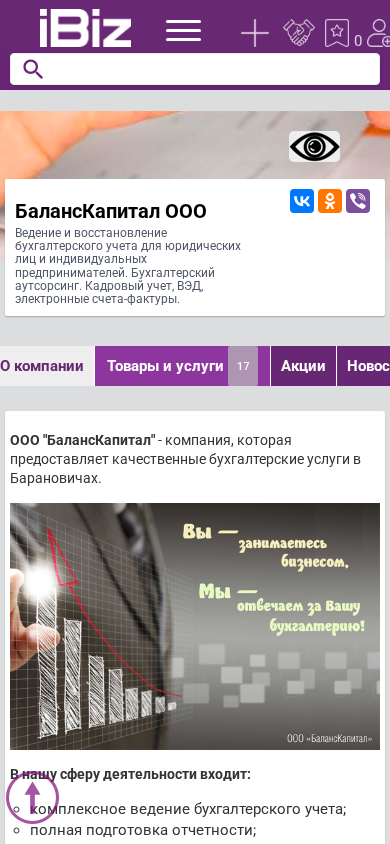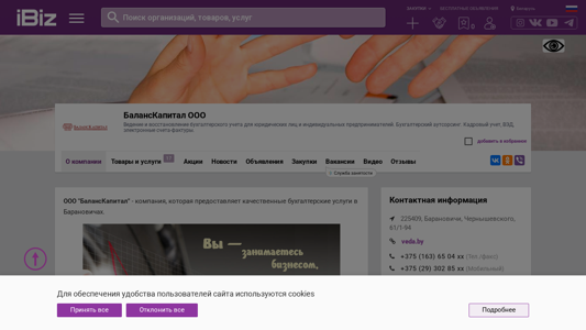 | Название / Заголовок | БалансКапитал ООО - Ведение и восстановление бухгалтерского учета для юридических лиц и индивидуальных предпринимателей. Бухгалтерский аутсорсинг. Кадровый учет, ВЭД, электронные счета-фактуры.. 225409, Барановичи, , Чернышевского, 61/1-94 |
