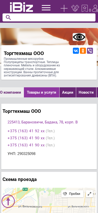 | AI-анализ | The web project "Торгтехмаш ООО" is a Belarusian company based in Baranovichi, specializing in the production and sale of industrial meat grinders, semi-trailers for transportation, plywood greenhouses, steel furniture and equipment, and aluminum structures. They also offer vats for antiseptic treatment of wood (ВПА). Their contact information includes three phone numbers and an address. The website includes sections for company information, products and services, and contact details. The company's UNP number is 290325098. The website is open for business from Monday to Friday, 9:00 AM to 6:00 PM, with no lunch break. The contact person is Julia Bulavskaya, Head of the Sales Department. |