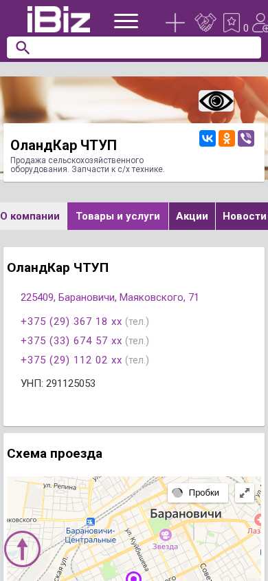 | Название / Заголовок | ОландКар ЧТУП - Продажа сельскохозяйственного оборудования. Запчасти к с/х технике.. 225409, Барановичи, , Маяковского, 71 |
