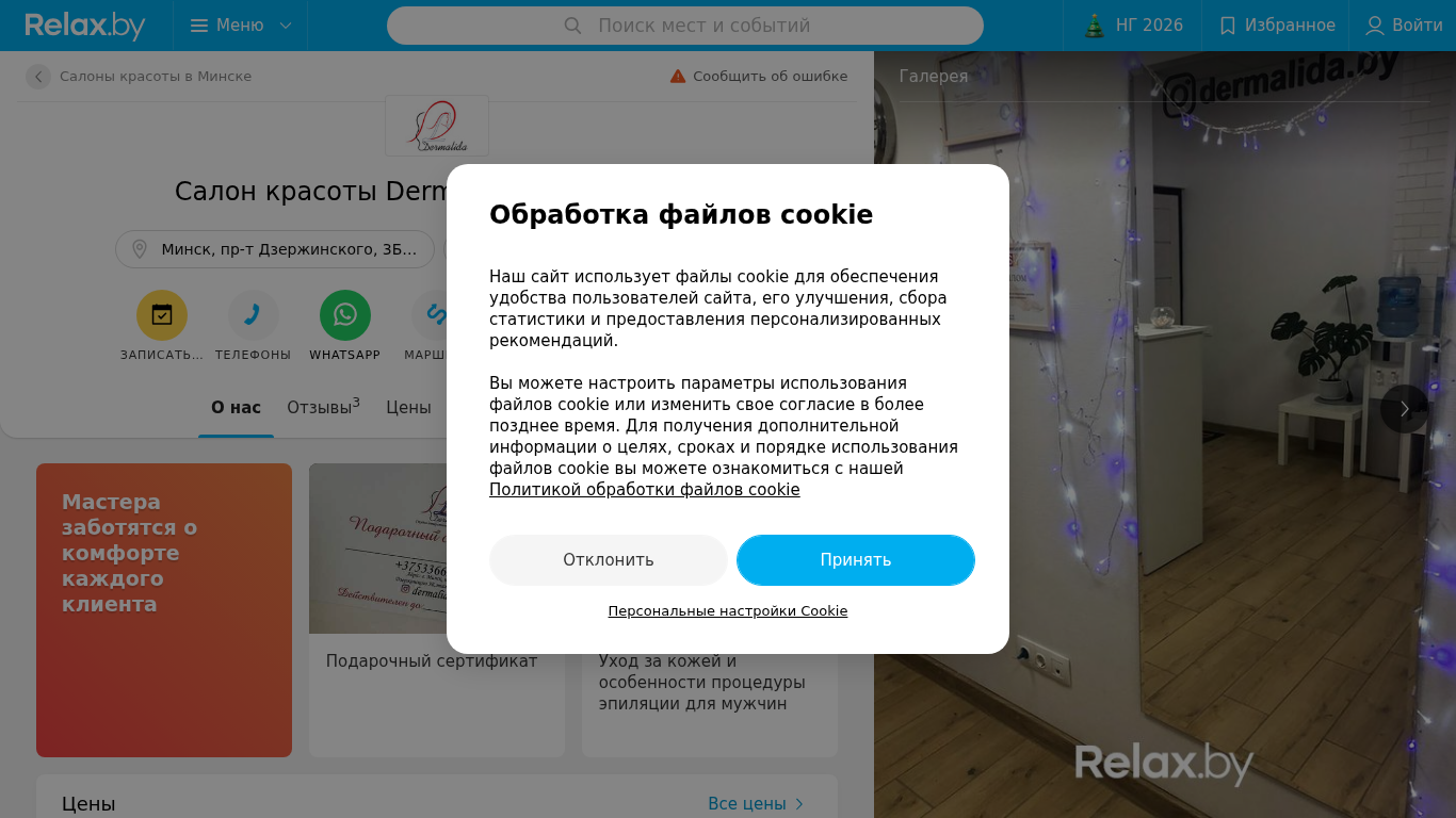 | SEO-описание | Салон красоты Dermalida (Дермалида) в Минске , пр-т Дзержинского 3Б – отзывы, адрес на карте, телефоны, график работы и карта проезда на Relax.by. |
