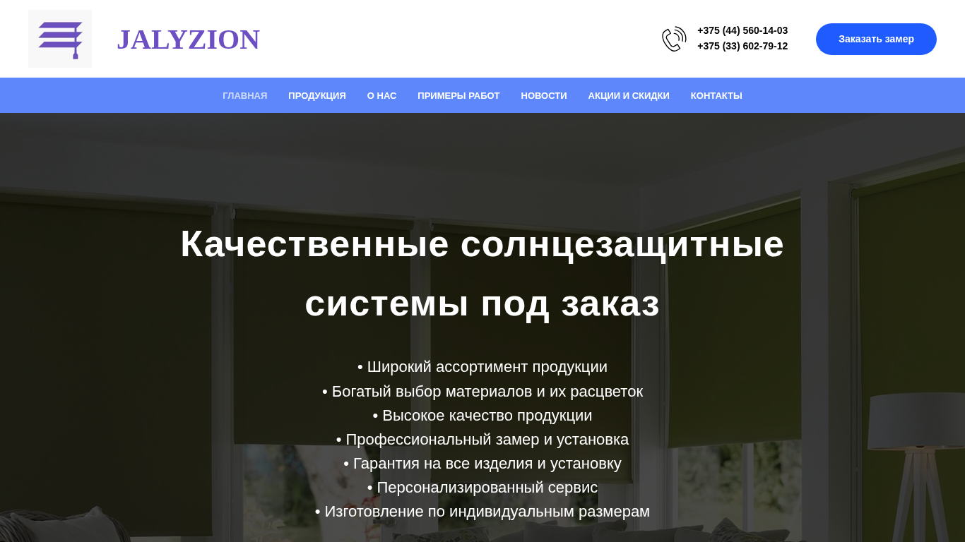 | AI-анализ | --- The portal JALYZION is an e-commerce website specializing in the sale of roll-shutters, sun protection systems, and Roman blinds. It offers custom-made products with over 100 variations of fabric for roll-shutters and blinds. The website provides discounts for both new and returning customers and offers financing. The main content includes sections for products, about the company, examples of work, news, and promotions, and contacts. The website emphasizes high-quality products, professional measurement and installation, a guarantee on all items and installation, and personalized service. Visitors can place a free consultation request and receive a catalog of materials from a master. The website also highlights a wide selection of designs and materials, excellent product quality, and a personalized approach to customer requests. |