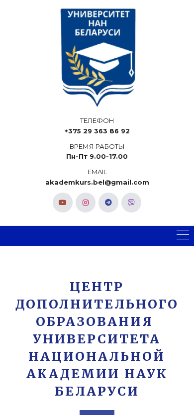 | SEO-описание | Центр дополнительного образования Университета НАН Беларуси пригашает на повышение квалификации и обучающие курсы. Ежегодно мы обучаем более 600 слушателей, занятия проводят более 60 преподавателей из 5 стран. Команда профессионалов разработала и на регулярной основе реализует более 40 программ |