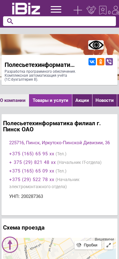 | AI-анализ | The portal is a Belarusian business website belonging to the Pinsk branch of PolesieTehInformatika OAO, which specializes in software development and comprehensive accounting automation using 1С:buhgalteria 8. The website provides information about the company's products and services, including electromontajne works and the sale and development of software. Users can find contact information, including phone numbers and addresses, and can also view company news, vacancies, and customer reviews. The website also features a section for free classified ads. The company's Unified State Register number is 200287363. The website operates Monday to Friday from 8:00 to 17:30, with a lunch break from 13:00 to 14:00. Contacts include Sergii Potapchuk, Head of |