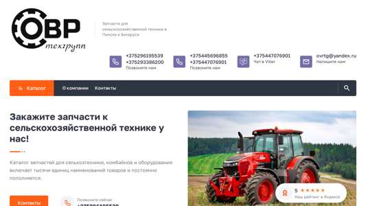 | SEO-описание | 🚜 ОВРтехгрупп: Запчасти для сельскохозяйственной техники Ваш надежный поставщик сельскохозяйственных запчастей Широкий ассортимент оригинальных и сертифицированных запчастей для сельхозтехники от ведущих производителей. В наличии более 10 000 наименований деталей для тракторов, комбайнов, плугов и другой сельскохозяйственной техники. - ✅ Преимущества работы с нами: • Прямые поставки от производителей • Гарантия подлинности всех товаров • Собственный склад с более чем 5000 наименований в наличии # • Индивидуальный подход к каждому клиенту • Помощь в подборе запчастей 🔧 У нас вы найдете: • Оригинальные запчасти для всех моделей тракторов • Детали для зерноуборочных комбайнов • Фурнитуру для сельскохозяйственной техники • Расходные материалы • Комплектующие для ремонта |