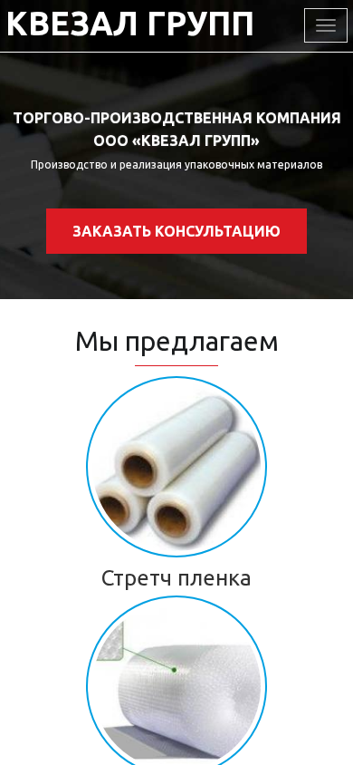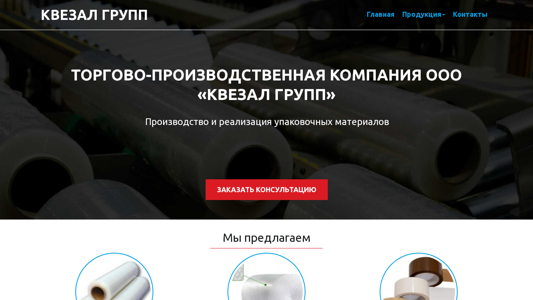 | AI-анализ | This website belongs to ООО «КВЕЗАЛ ГРУПП» (OOO "KVEZAL GROUP"), a Belarusian company producing and selling packaging materials. The homepage features information about the company's main products: stretch film, inflatable film, and adhesive tape (scotch). The company emphasizes the benefits of working with them, such as a team of high-qualified professionals, modern equipment, and quality raw materials. They guarantee the best prices in Belarus and offer consultations to potential clients. OOO "KVEZAL GROUP" has been operating in the Belarusian market since 2015 and is known for providing high-quality packaging materials. They serve clients from various industries, including trade, production, and construction, and offer discounts to regular customers. The company's mission is to provide optimal |