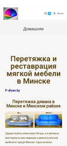 | SEO-описание | Перетяжка и реставрация мягкой мебели в Минске P-divan.by Перетяжка дивана в Минске и Минском районе Привет, меня зовут Игорь, и я являюсь мастером по реставрации и ремонту мягкой мебели в городе Минске. Одно из моих главных преимуществ заключается в том, что я работаю на дому у клиента, в его присутствии. Это означает, что клиент может контролировать качество работы на каждом этапе! |